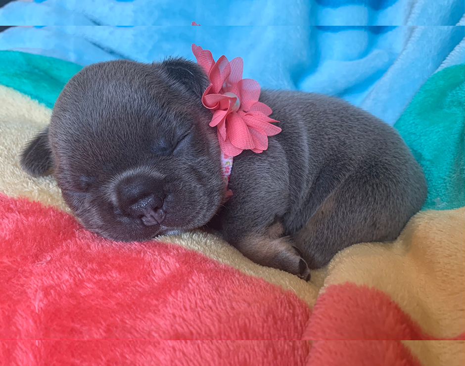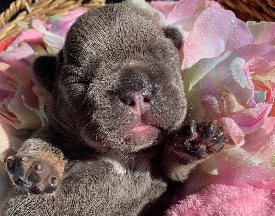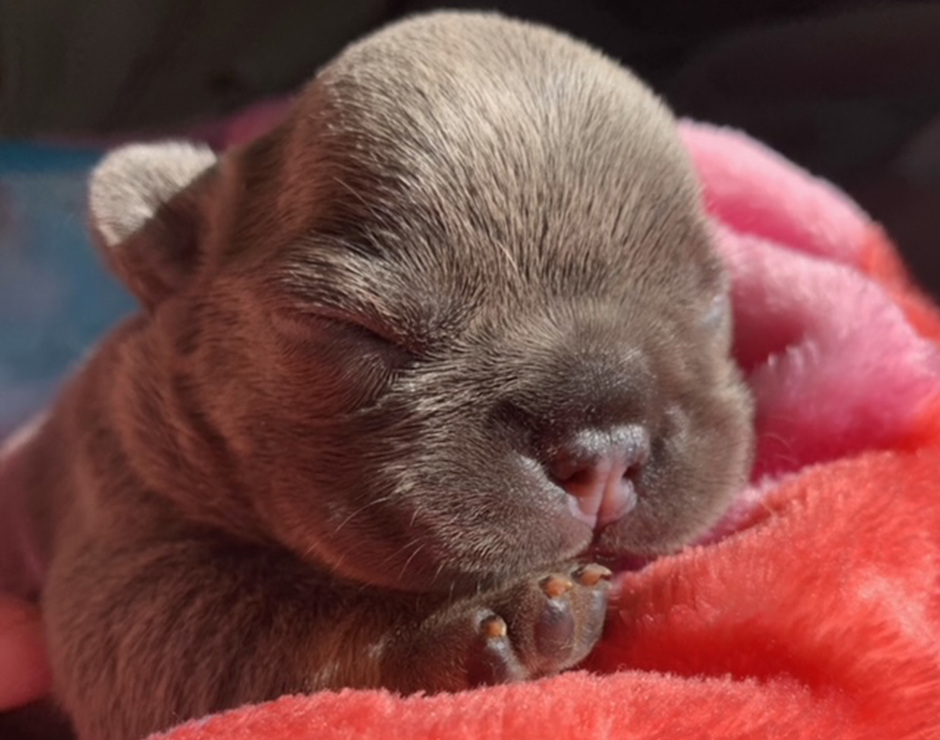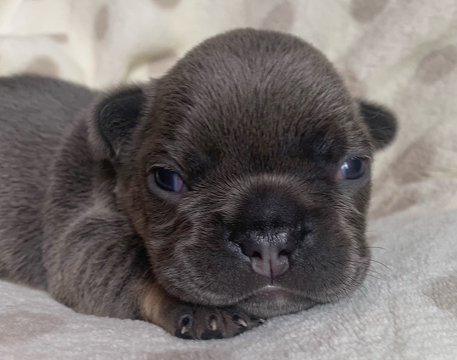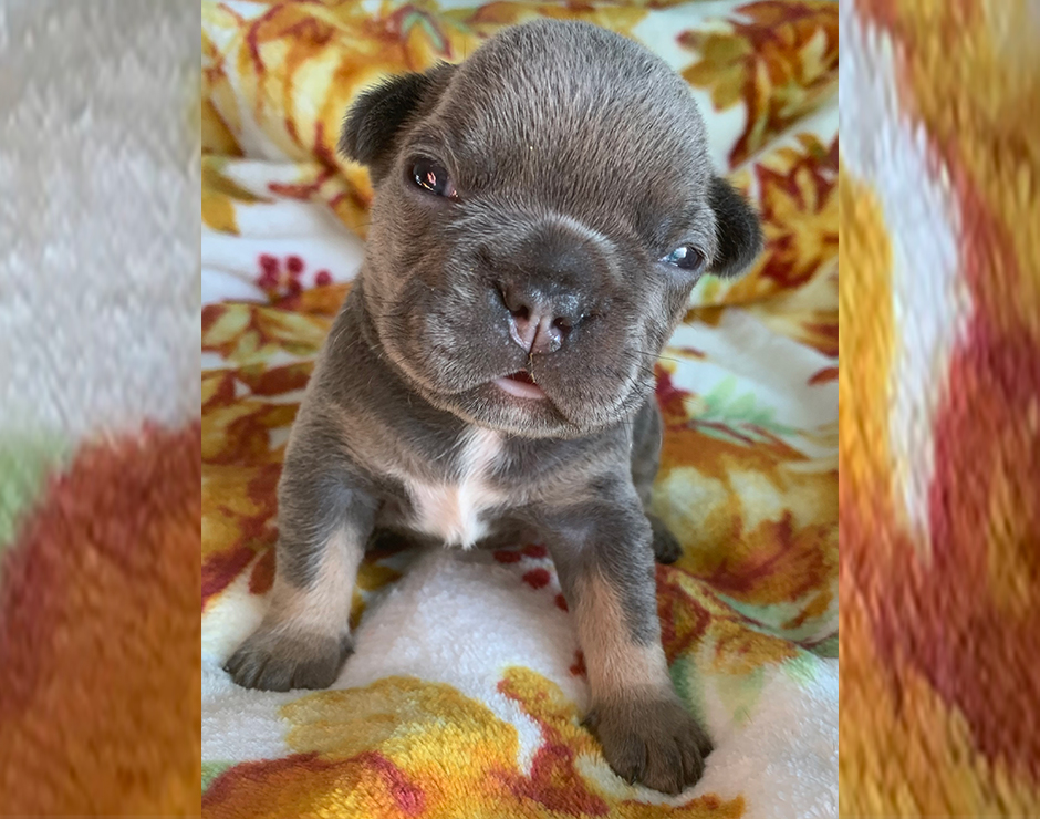 Parents: Godiva is Chocolate Tri and TIKTOK is a stud from Hot Stuff Frenchies; Blue/Tan Tweed Merle, carries chocolate & L4 Fluffy