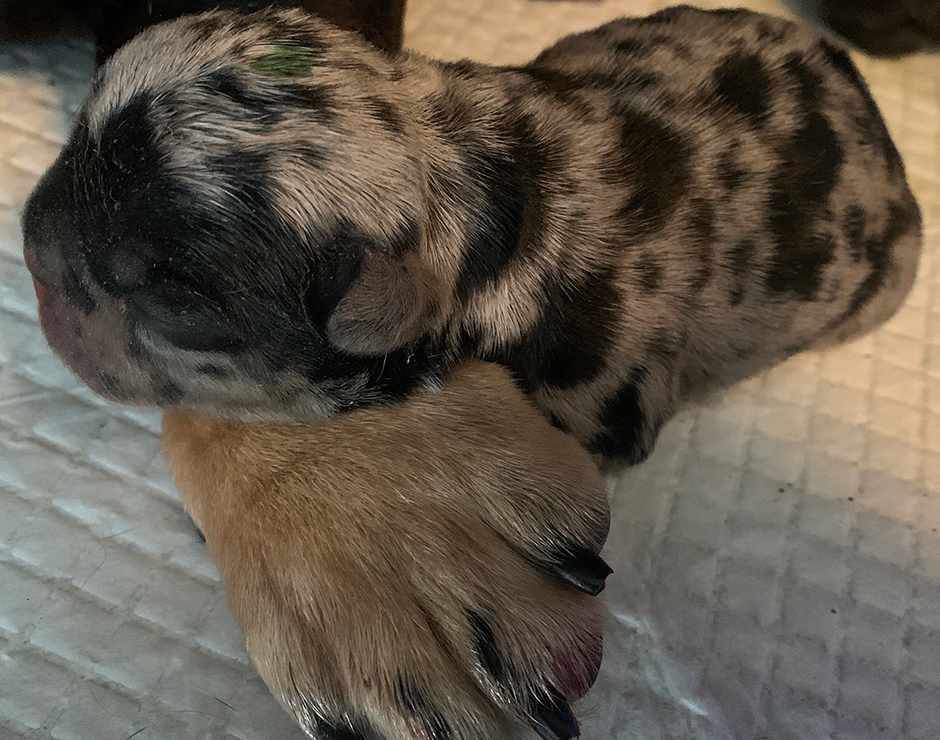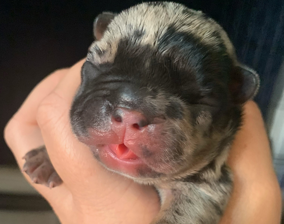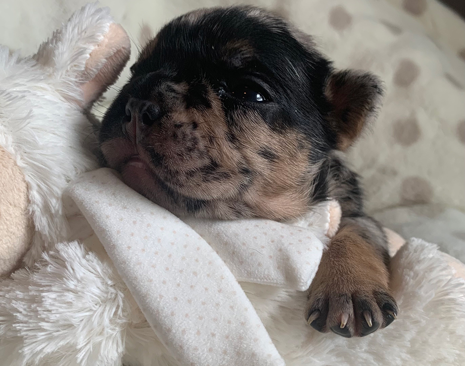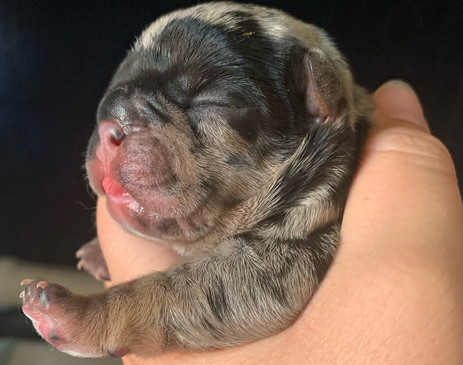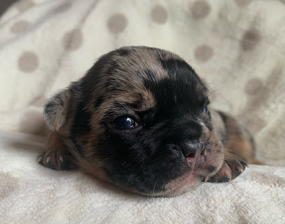 Parents: Godiva is Chocolate Tri and TIKTOK is a stud from Hot Stuff Frenchies; Blue/Tan Tweed Merle, carries chocolate & L4 Fluffy
