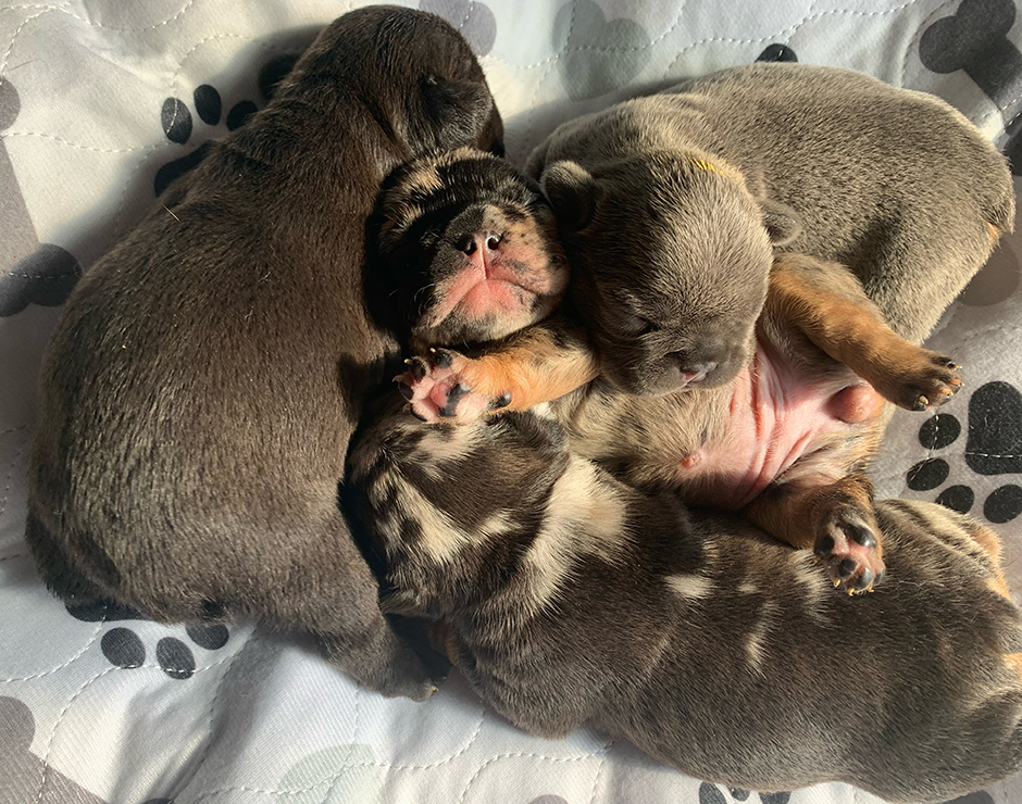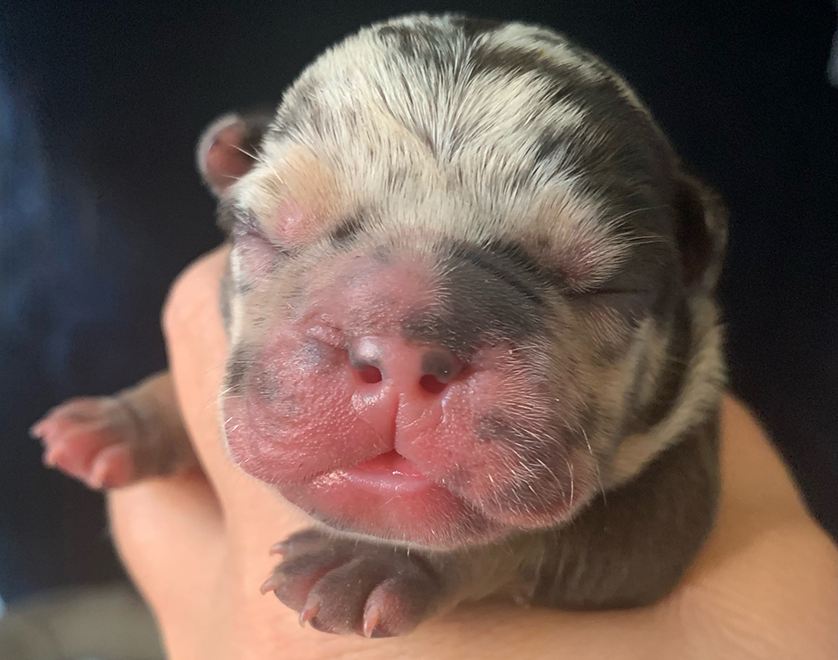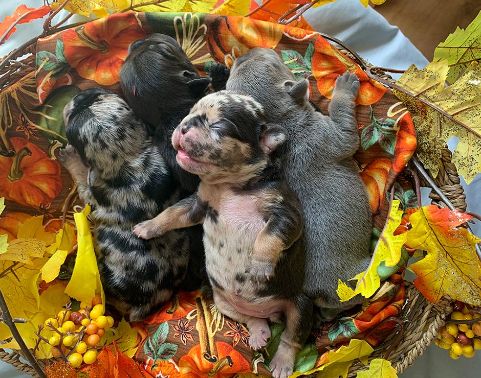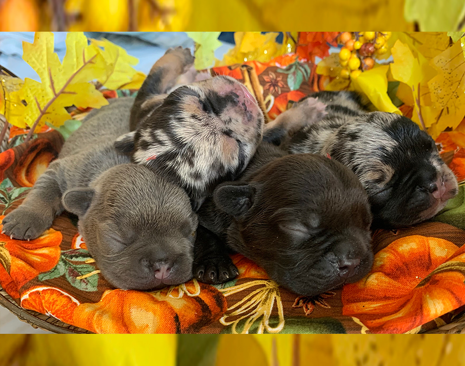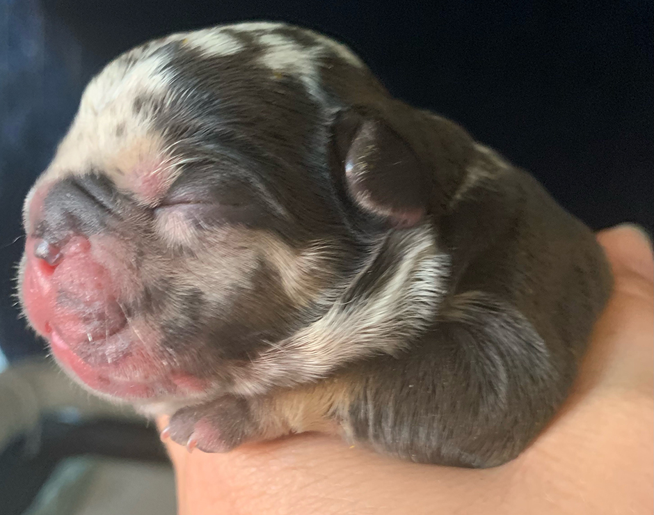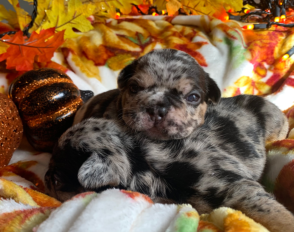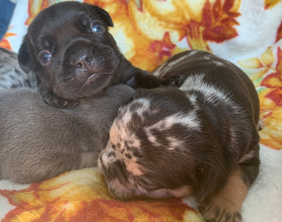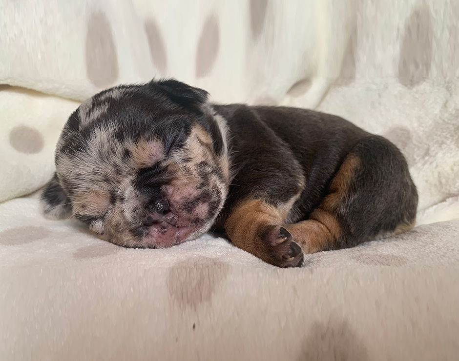 Parents: Godiva is Chocolate Tri and TIKTOK is a stud from Hot Stuff Frenchies; Blue/Tan Tweed Merle, carries chocolate & L4 Fluffy