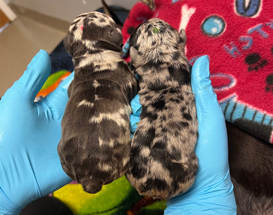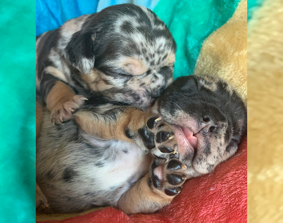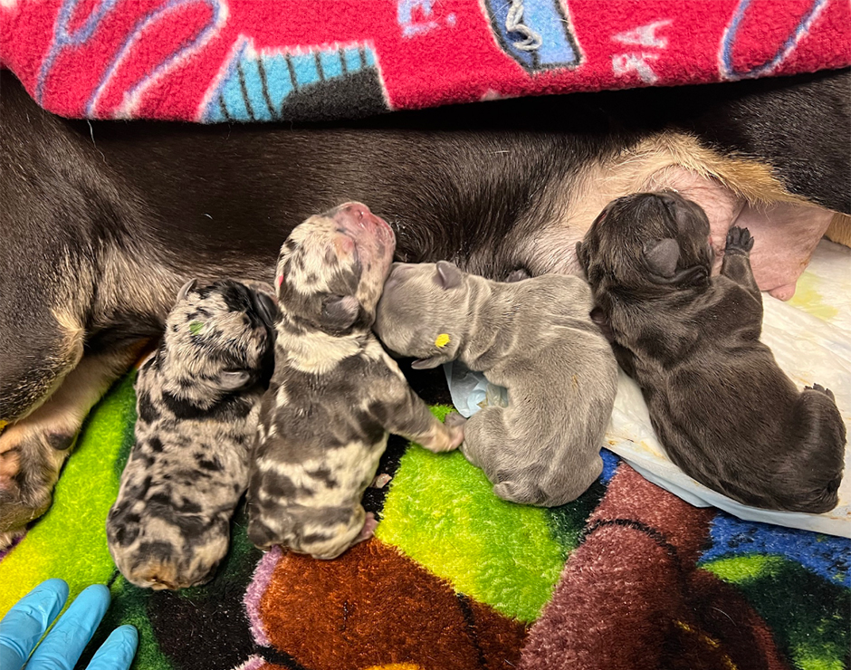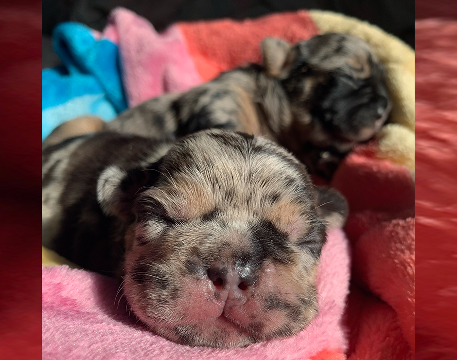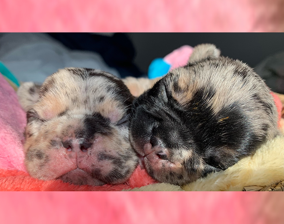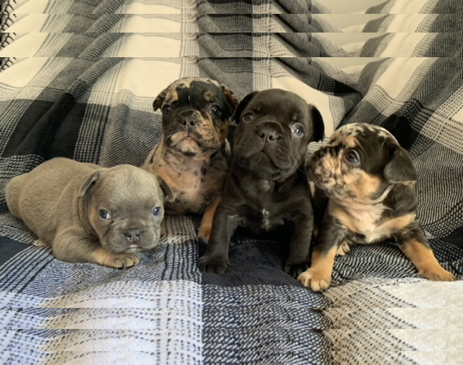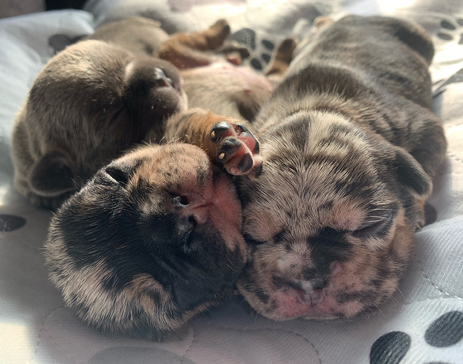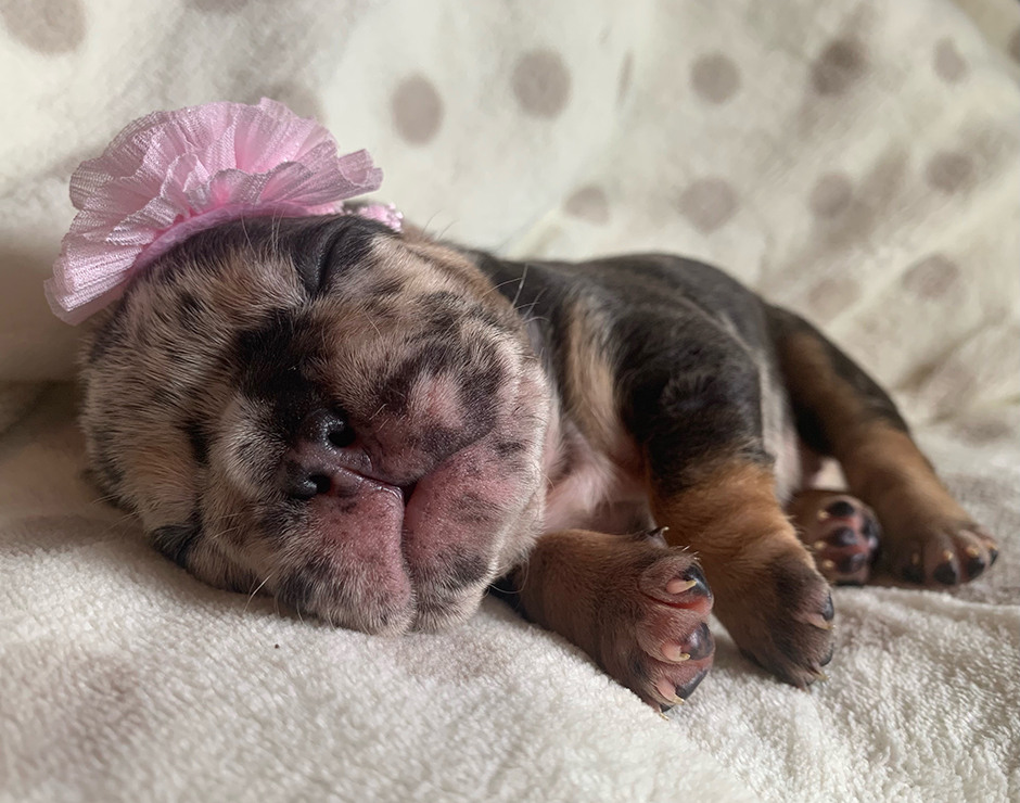 Parents: Godiva is Chocolate Tri and TIKTOK is a stud from Hot Stuff Frenchies; Blue/Tan Tweed Merle, carries chocolate & L4 Fluffy